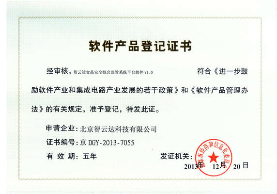 軟件產品登記證書——智云達食品安全綜合監管體統平臺軟件