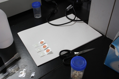 2、取農(nóng)藥殘留檢測(cè)卡,將西紅柿樣品提取液的液滴滴在白色藥片上,放置 10min 進(jìn)行預(yù)反應(yīng),預(yù)反應(yīng)后的藥片表面必須保持濕潤(rùn)。