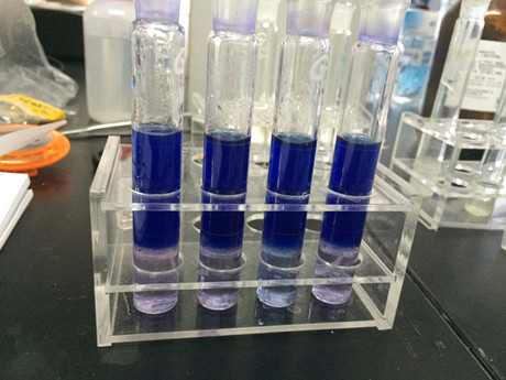 3、樣品管:取制備好的樣品液加入A溶液1mL,搖勻,加入三氯甲烷4mL,蓋上塞子,較為快速顛倒20次,靜置5min,取下層溶液進行檢測。