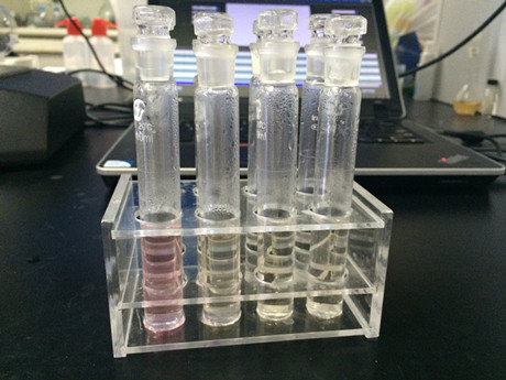 3、樣品管:吸取2mL樣品處理液于10mL比色管中,加入2mL山梨酸試劑一,加上蓋子,搖勻,于沸水浴中加熱7分鐘,立即加入2mL山梨酸試劑二,搖勻,繼續沸水浴加熱10分鐘,取出涼水冷卻3分鐘。