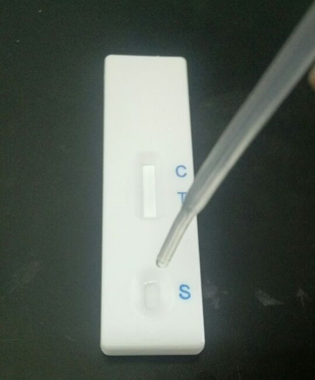 1、從包裝袋中取出試紙卡,打開后平放在桌面上,用吸管吸取待檢樣品溶液,滴加 3 滴于加樣孔中,加樣后開始計時