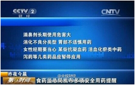 @央視財經【警惕!食藥監總局:滴鼻劑、甘草片不能長期使用!】國家食藥監總局提醒消費者:滴鼻劑長期使用危害大;女性經期要當心,某些抗凝血藥、活血化瘀類中藥、瀉藥等幾類藥品應暫停應用。此外,復方甘草片易成癮,不能長期使用;氨基酸也并不能補腦,攝入多了還會加重肝腎負擔。
