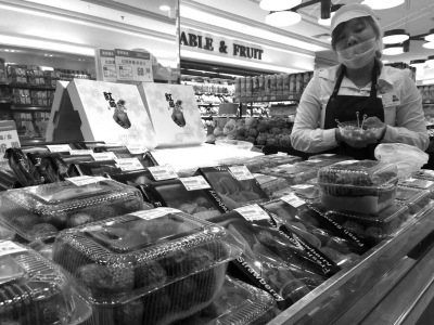 昨天,三里屯某超市,銷售人員在對草莓促銷。京華時報記者陶冉攝