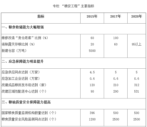 通過實施“糧安工程”,將全面深化細化和拓展《糧食行業(yè)“十二五”發(fā)展規(guī)劃綱要》目標,并使其更清晰完善。進一步加強糧食倉儲物流設施、糧油質(zhì)量安全檢驗監(jiān)測能力建設和農(nóng)戶科學儲糧專項,補充完善應急供應體系、強化糧情監(jiān)測和促進節(jié)糧減損等相關目標,并將相關建設目標延伸到“十三五”時期。