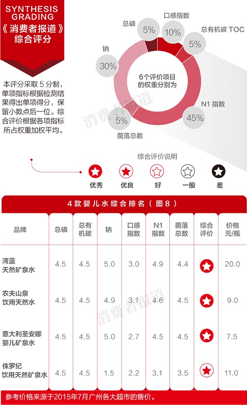 通過綜合比較N1指數、總有機碳TOC、總磷、鈉、口感指數、菌落總數等指標,礦泉水、天然水中達能益力、景田百歲山性能強悍,而在嬰幼兒飲用水中侏羅紀性能低于其它三款,本刊建議消費者慎重選購。