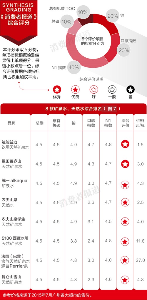 2015年7月,《消費者報道》送檢了10品牌10款天然礦泉水和2款天然水,包括農夫山泉、昆侖山、5100、景田百歲山、統一alkaqua、法國perrier、達能益力等7款天然礦泉水,以及農夫山泉、侏羅紀、灣藍、圣安娜等4款嬰幼兒水,還有一款農夫山泉天然水。