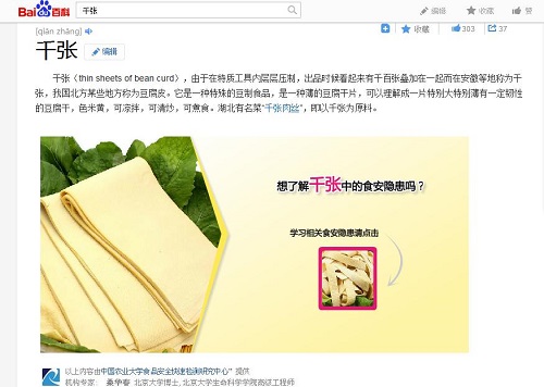 北京智云達科技有限公司作為百度百科和百度文庫的權威合作機構,在2015年上半年,公司利用自身食品安全方面的知識資源,為百度文庫提供關于食品以及營養的各類文章810余篇,為百度百科提供權威編輯詞條101個,并在千張、豆皮、餃子等食品詞條中嵌入食品安全隱患flash 53個,點擊即可了解相關食品中存在的食安隱患及對人體的危害。