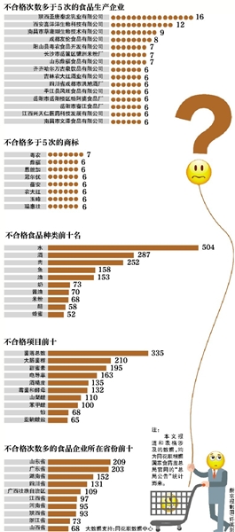 根據(jù)新京報(bào)統(tǒng)計(jì),自今年1月1日至11月26日,國家食藥監(jiān)總局在“總局公告”里公布了3600余批次不合格食品,有具名的“生產(chǎn)企業(yè)”2293家。根據(jù)同花順數(shù)據(jù)中心分析,449家企業(yè)被通報(bào)2次(含)以上,占19.6%。而被通報(bào)達(dá)5次及以上的企業(yè)數(shù)量為29家,占具名生產(chǎn)企業(yè)總數(shù)的1.3%。