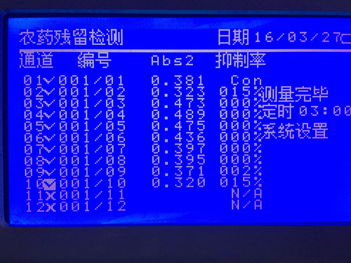 檢測結果如圖所示,結果以酶被抑制的程度,即抑制率表示。當果蔬樣品提取液對酶的抑制率為40~50%時,則表明被測樣品為可疑農殘超標樣品;當抑制率≥50%時,表示蔬菜中有高劑量有機磷或氨基甲酸酯類農藥存在,樣品為陽性結果。所以樣品中農藥殘留符合國家標準。