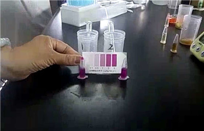 3. 10min后與標準比色卡對比,找出與速測管中溶液顏色相同的色階,該色階上的數值即為樣品中亞硝酸鹽(NaNO2計)的含量mg/L。