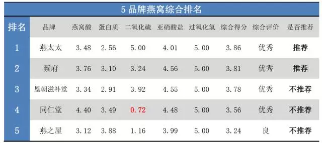 五品牌燕窩中,同仁堂燕窩二氧化硫殘留最高,為10.7mg/kg;燕太太燕窩未檢出。