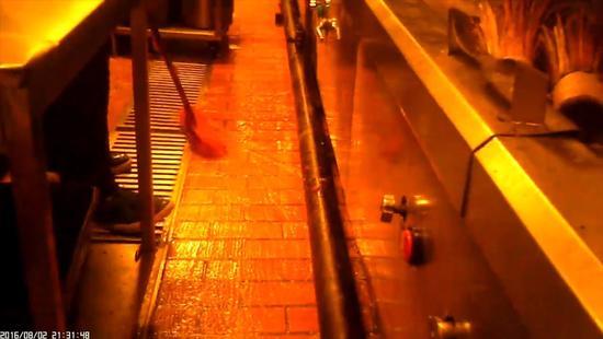 記者隨即被分配到廚房做一名配菜員,負(fù)責(zé)配置醬料和菜品原料。記者發(fā)現(xiàn),廚房墻面和地面常常積累了污水和油漬,為了保潔,廚房師傅便不定期對(duì)墻面和地面進(jìn)行刷洗和清掃,而在清掃之后,廚房師傅竟將掃把放入用于做菜的鍋內(nèi)進(jìn)行漂洗。見記者表情驚訝,旁邊的一名廚房師傅不以為然地說:“這里本來就是掃把洗鍋啊!”