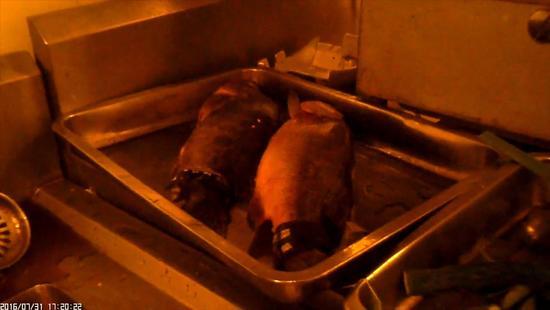 而蹲守在廚房的記者發(fā)現(xiàn),配菜員接到點(diǎn)菜信息后從冰柜里取出一條死亡已久的鱸魚送到廚房并進(jìn)行烹飪。不多久,這條死鱸魚便成了一道絢麗奪目的“松鼠桂魚”菜肴。