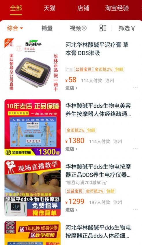 不過在淘寶、京東等電商平臺,搜索河北華林、酸堿平DDS等關(guān)鍵詞時,發(fā)現(xiàn)仍有部分該系列產(chǎn)品在售賣,售價從幾百元至幾千元不等。