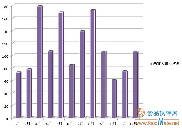 2018年共有1351批次超三千多噸食品檢出不符合我國(guó)法律法規(guī)和標(biāo)準(zhǔn)而未準(zhǔn)入境。每月未準(zhǔn)入境的食品批次數(shù)量如圖所示,其中,3月、5月、8月檢出的不合格批次數(shù)量居多。