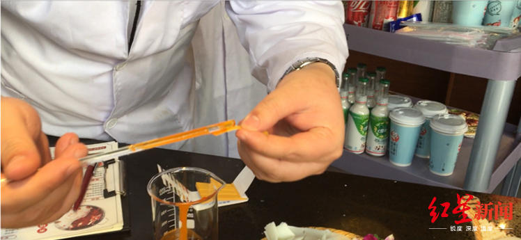 3月11日,紅星新聞記者來到這家火鍋串串店試吃。 將火鍋調料倒入鍋中后,兩名身穿白大褂的實驗人員來到桌前,為記者現場檢測是否是老油。