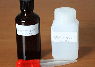 吸取樣品 2mL 于試管中,加入 1ml 試劑 1,搖勻后再加入 1ml試劑 2,振蕩混勻,置于沸水燒杯中維持 1 分鐘,觀察試管中顏色的變化,若出現不同深度的咖啡色,表明樣品中摻有甲醛,若出現淡黃色表明樣品中未摻加甲醛。