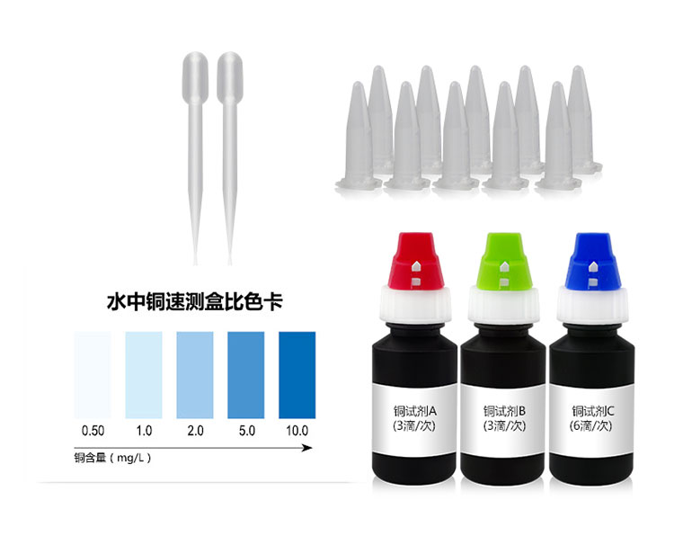 水中銅與檢測試劑反應(yīng)生成藍(lán)色化合物,含量越高藍(lán)色越深。