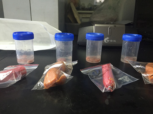 首先我們將吳先生提供的兩種樣品分別進行編號,并進行少量切割稱重,稱取1.0g火腿樣本,加入10ml蒸餾水;
