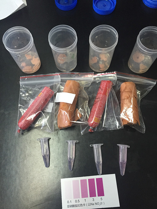 通過觀察我們可以發現2號相對顏色較深,其他顏色基本不變,這個說明路邊烤腸中亞硝酸鹽含量超標,而商場火腿亞硝酸鹽含量基本符合標準;