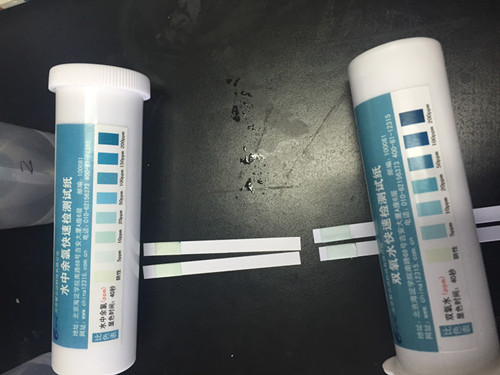 之后進行水中余氯和雙氧水檢測,用吸管吸取少量水樣,滴加到試紙條的顯色區域,靜置1分鐘后與對比條進行顏色比對。